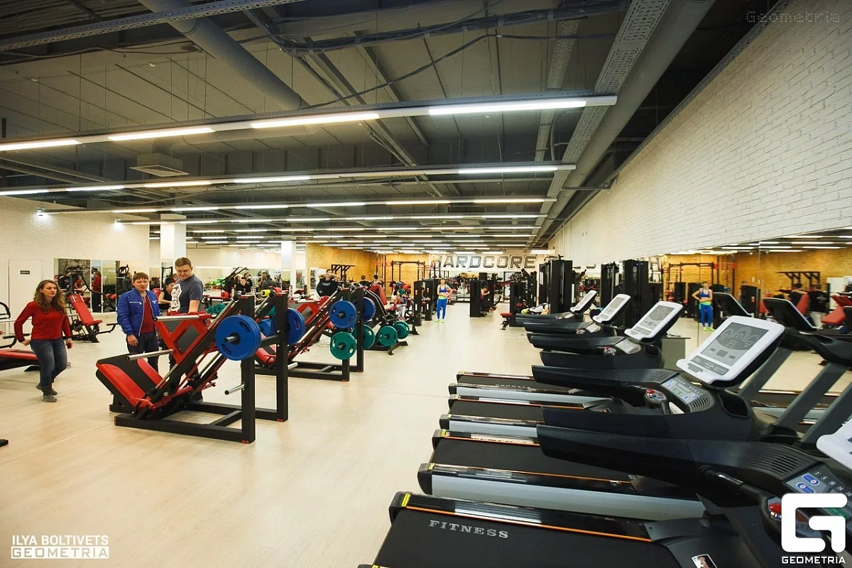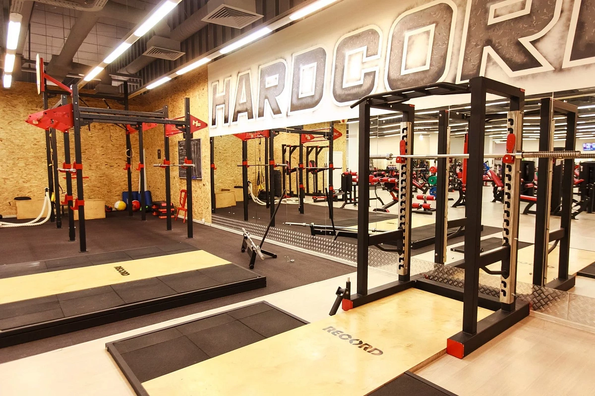 В тренажерном зале HardCore Gym "РАДУГА" собрано более 60 тренажеров, площадь зала 800 кв. метров, зал групповых тренировок и зона для CrossFit.